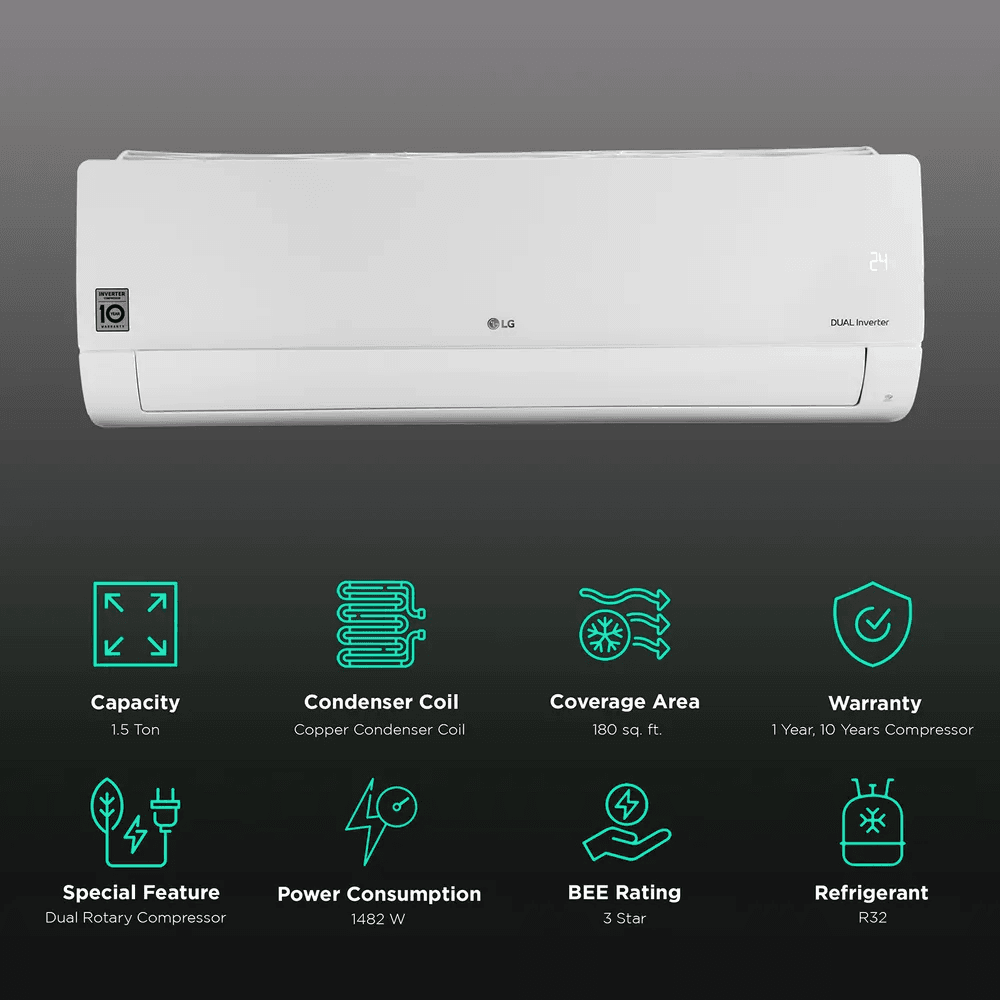 1.5 Ton Dual Inverter AC, 3 Star Rating Copper Condenser 1 Year Comprehensive Warranty, 10 Years Compressor Warranty, 5 Years PCB Warranty For Rooms up to 180 sqft Power Consumption: 1482 W Refrigerant: R32 ADC Sensor, HD Filter with Anti Virus Protection