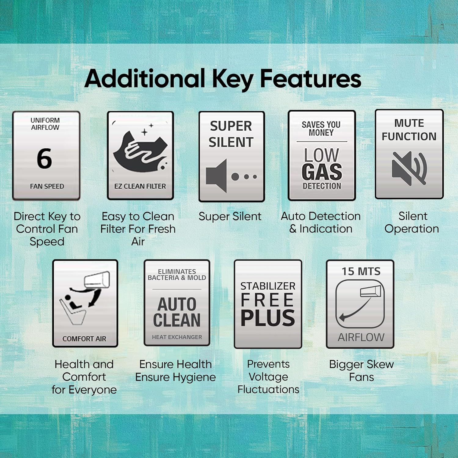Split AC with inverter compressor: Variable speed compressor which adjusts power depending on heat load. AI 6-in1 Convertible feature with 6 cooling modes allows for flexible temperature control by operating in different tonnages by adjusting cooling capacity (40% to 110%) to match different needs basis room size or occupancy, enhancing energy efficiency and providing personalized comfort with minimal effort (T&C Apply- *Maximum Cooling Capacity may vary from model to model between 110% to 116%.) Capacity: 1.5 Ton Suitable for medium sized rooms (151 to 180 sq ft.); Air Circulation: 653/1236 (In/Out) CFM, Cooling Capacity 5000 W & Ambient Temperature: 52 degree Celsius with 4 way air swing Energy Rating : 5 Star - Best in class efficiency | Annual Energy Consumption: 744.99 Units Per Year| ISEER Value: 5.2 (Please Refer Energy Label On Product Page Or Contact Brand For More Details) Manufacturer Warranty: 1 Year on product, 5 Years on PCB and 10 Years on Compressor with Gas Charging (T&C Apply) Condenser Coil: Copper With Ocean Black Protection prevents From Rust & Corrosion; Increase Durability ; Uninterrupted Cooling Key Features: Dual Inverter Compressor, AI Convertible 6-in-1 Cooling, VIRAAT Mode, HD Filter with Anti-Virus Protection, 15 MTS Airthrow, ADC Sensor, Cools at 52⁰ C, Stabilizer free operation within 120V-290V voltage range , Magic Display for temperature, Noise Level: IDU - 31 (db) & ODU – 56 (db) Special Features: Gold Fin+ - Increase durability, Ocean black protection, Ez Clean Filter, Low gas detection, 100% Copper Condensor, 6 Fan Speed steps; Hi grooved Copper; Smart Diagnosis System, Comfort Air, Monsoon Comfort/Fresh Dry, Auto Clean, Mute, On/ Off Timer, Sleep Mode, Auto Restart (Memory), On/Off Indicator; Dehumidifier