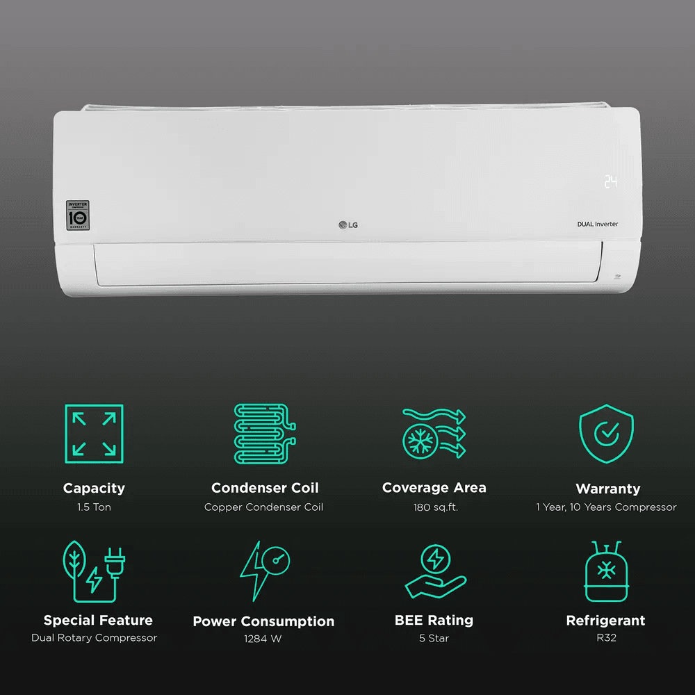 1.5 Ton Dual Inverter AC, 5 Star Rating Copper Condenser 1 Year Comprehensive Warranty, 10 Years Compressor Warranty, 5 Years PCB Warranty For Rooms up to 180 sqft Power Consumption: 1284 W Refrigerant: R32 AI+ Technology, Ocean Black Protection, HD Filter with Anti Virus Protection